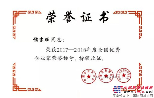 本会副会长单位宁波如意董事长储吉旺,被授予“2017-2018年度全国优秀企业家”称号