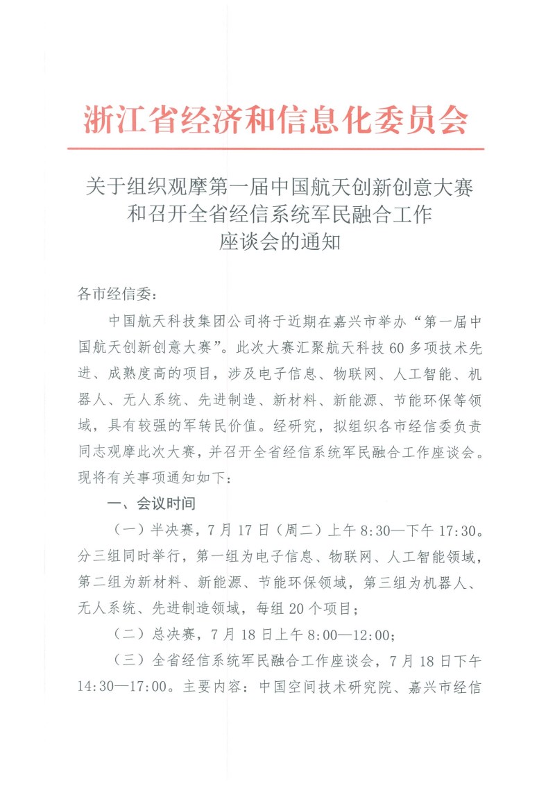 转发 关于组织观摩第一届中国航天创新创意大赛和召开全省经信系统军民融合工作座谈会的通知