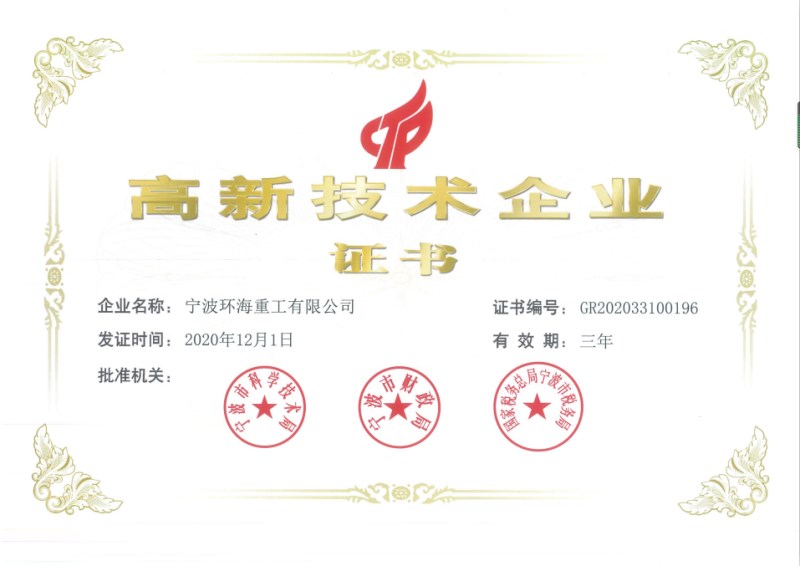 喜讯!热烈祝贺宁波环海重工有限公司获得国家级“高新技术企业证书”。
