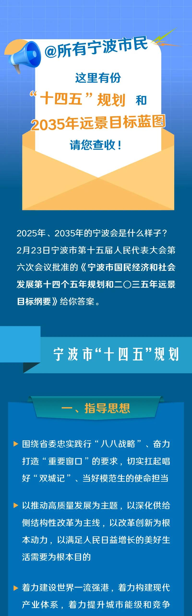 2月23日,宁波市第十五届人民代表大会第六次会议批准了《宁波市国民经济和社会发展第十四个五年规划和二〇三五年远景目标纲要(草案)》。