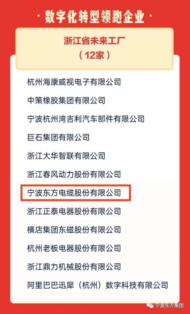 会上,浙江对制造业高质量发展示范、数字化转型领跑企业、冠军企业等制造业先进进行了表彰。东方电缆作为国家制造业单项冠军企业和数字化转型领跑企业(浙江省未来工厂)被表彰,董事长夏崇耀上台接受表彰。