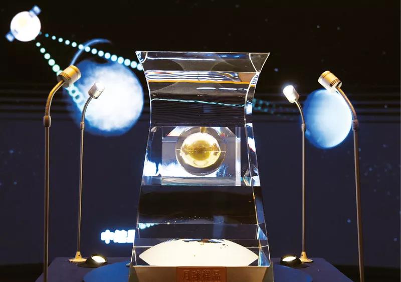 2020年12月17日,嫦娥五号返回器携带月球样品安全着陆,中国探月工程“绕、落、回”三步走规划如期完成,首次实现我国地外天体采样返回。图为2021年2月27日在中国国家博物馆拍摄的月球样品001号。 新华社记者 金良快/摄