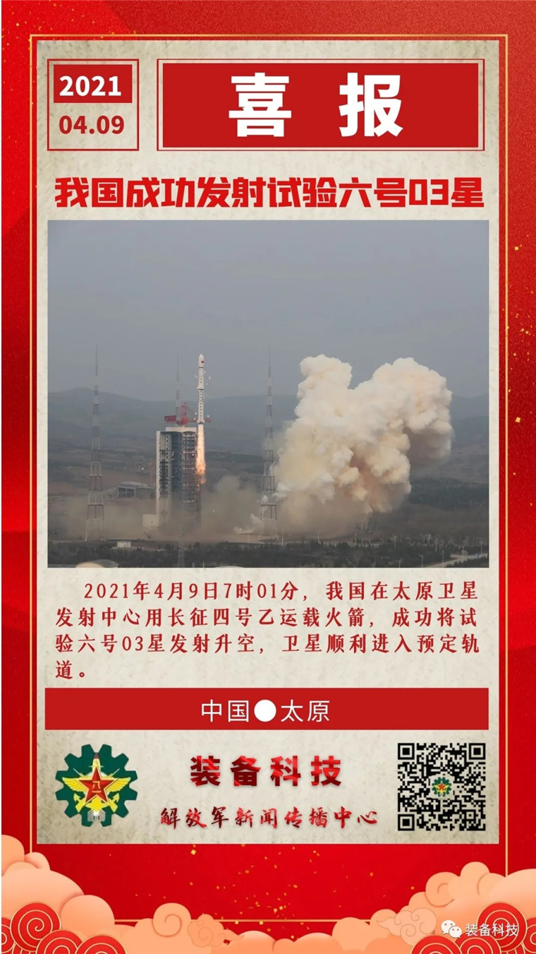 解放军报太原4月9日电(徐童、记者岳雨彤)今天7时01分,我国在太原卫星发射中心用长征四号乙运载火箭,成功将试验六号03星发射升空,卫星顺利进入预定轨道。