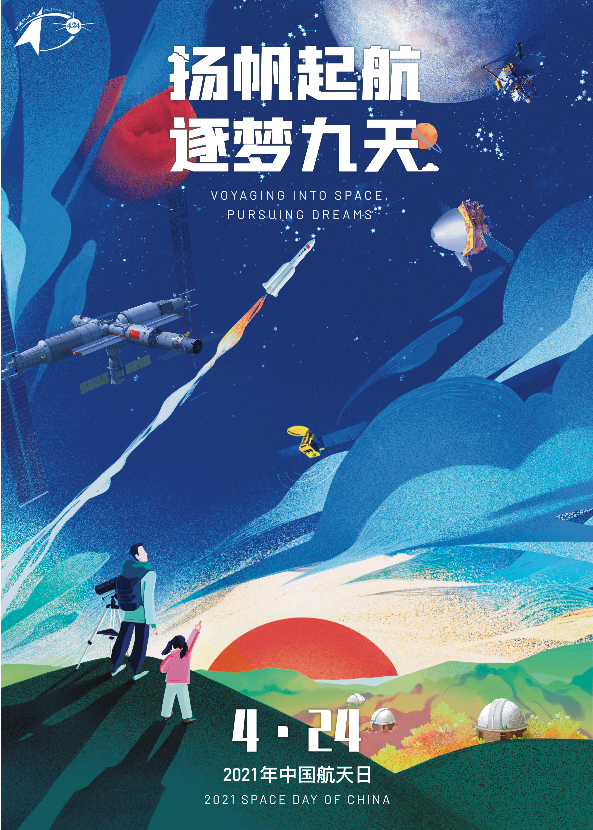 该海报紧扣“扬帆起航 逐梦九天”的主题,整体构图完整,色彩和谐,富有想象力。画面中,阳光撒向大地,温暖笼罩山林,在南京紫金山天文台的衬托下,一位父亲带着女儿遥望星空,讲述着航天功臣——嫦娥五号、长征五号B的动人故事,畅想着航天明星——天问一号和中国空间站的惊世壮举,勾勒出一幅温馨而美好的画面,寓意着中华民族不懈追求的航天梦。