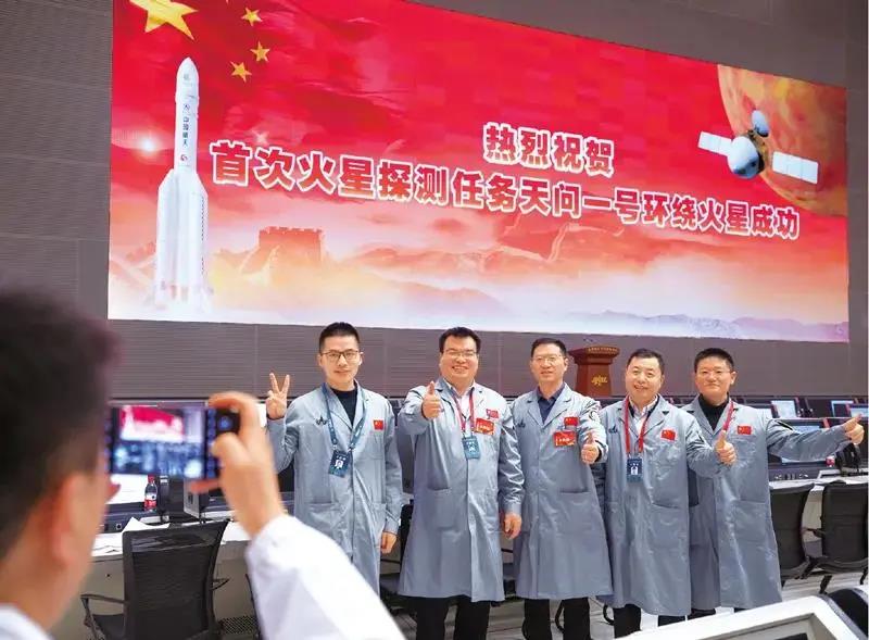2021年2月10日,在北京航天飞行控制中心指挥大厅,航天科研人员庆祝我国首次火星探测任务“天问一号”环绕火星成功。新华社记者 金立旺/摄
