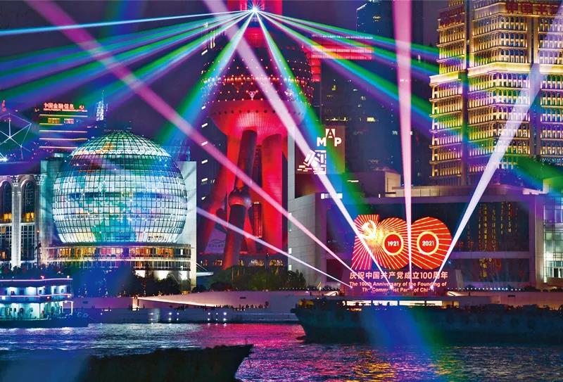 2021年6月19日,上海庆祝建党百年灯光系列活动拉开序幕,黄浦江畔,灯光璀璨。人民视觉 茅正元/摄
