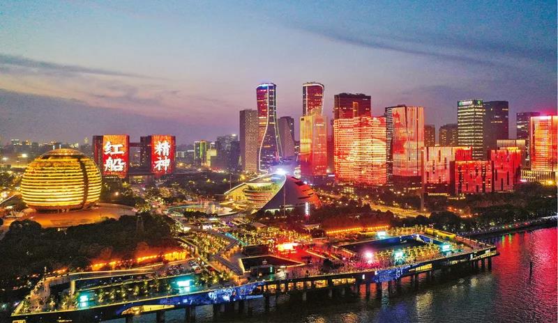 2021年6月24日晚,浙江杭州钱塘江畔上演庆祝建党100周年主题灯光秀。人民视觉 董旭明/摄