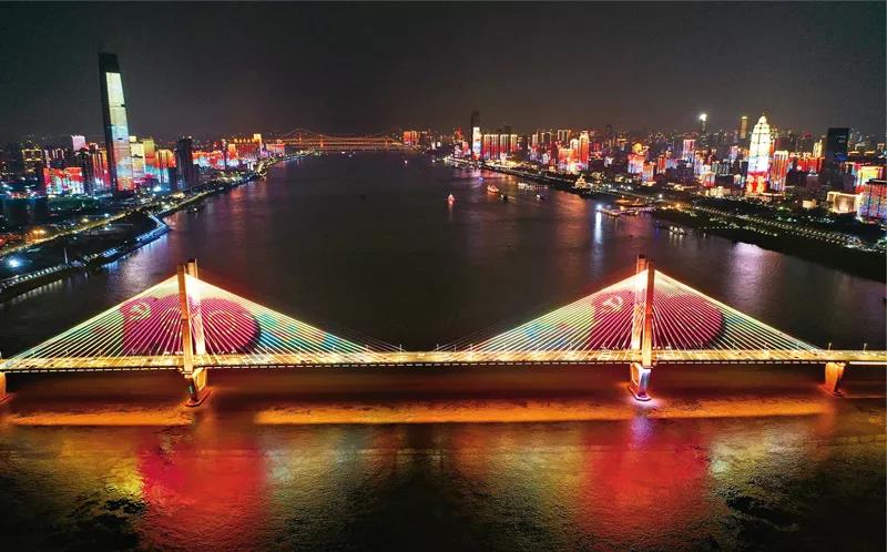 2021年6月24日晚,以“百年征程 波澜壮阔 百年初心 历久弥坚”为主题的长江灯光秀点亮湖北武汉。人民视觉 周国强/摄