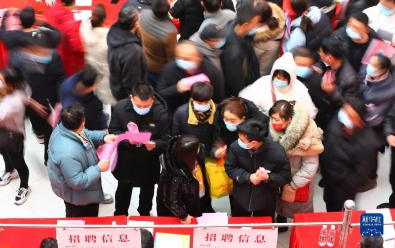 求职人员在山东省滕州市“春风送岗”春季人才招聘会上寻找就业岗位(2022年2月19日摄)。新华社发(李志军 摄)