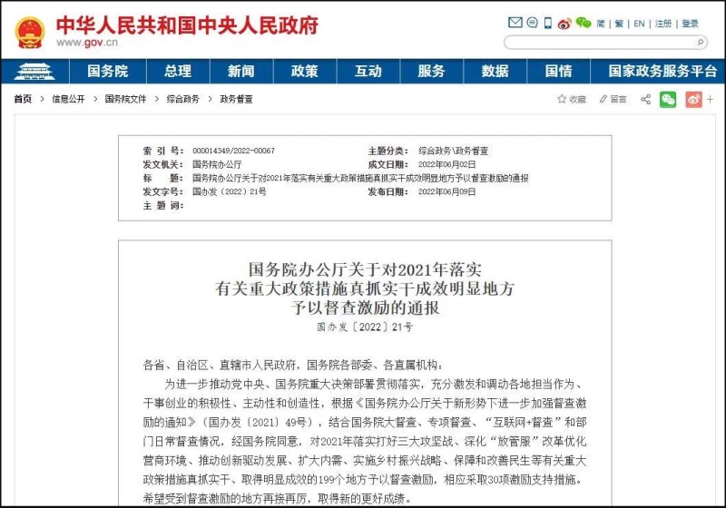 6月9日,国务院办公厅发布通报,对2021年落实打好三大攻坚战、深化“放管服”改革优化营商环境、推动创新驱动发展、扩大内需、实施乡村振兴战略、保障和改善民生等有关重大政策措施真抓实干、取得明显成效的199个地方予以督查激励,相应采取30项激励支持措施。宁波共获得3项督查激励。一起来看↓