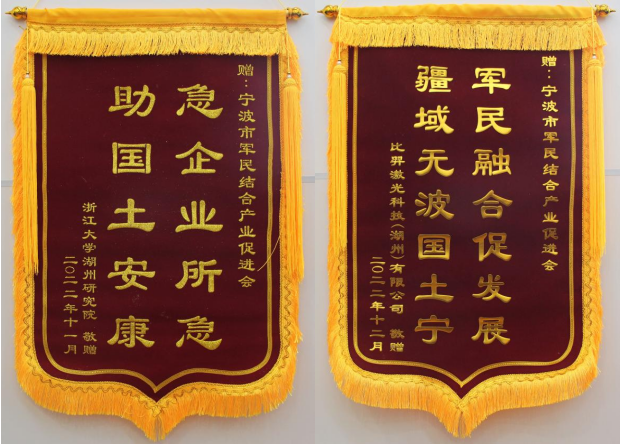 浙江大学湖州研究院、比羿(激光)科技(湖州)有限公司特意邮寄过来两面锦旗,为本会在双方需求对接过程中做出的努力表示衷心的感谢。
