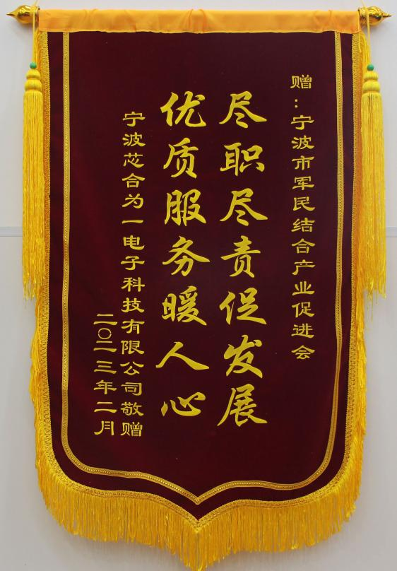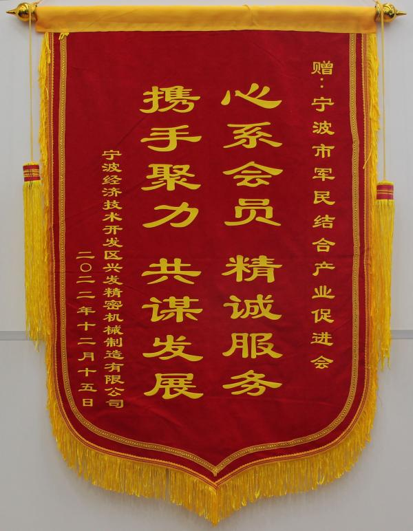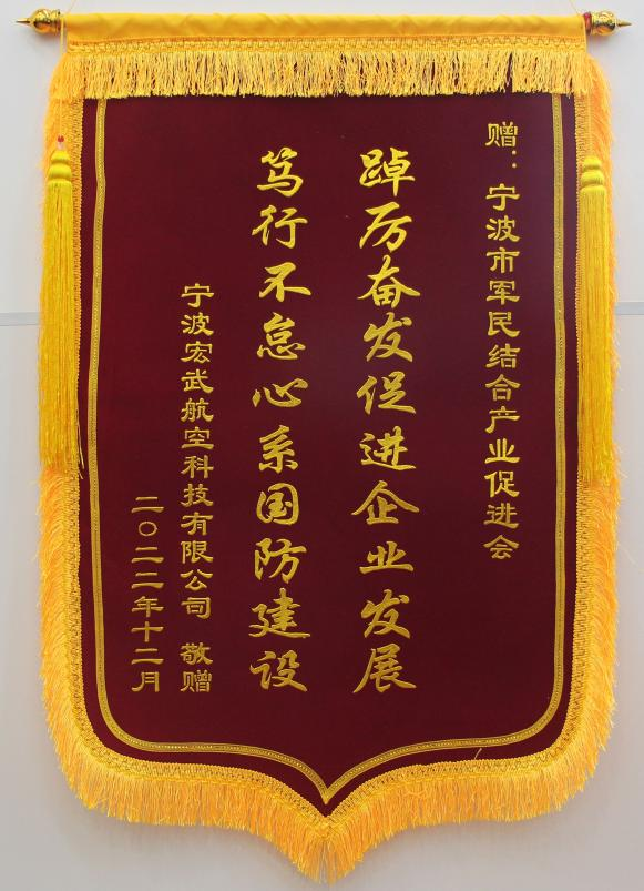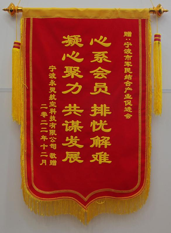本会理事单位宁波永灵航空科技有限公司、会员单位宁波宏武航空科技有限公司、宁波金鑫轴承科技有限公司、宁波经济技术开发区兴发精密机械制造有限公司、宁波芯合为一科技有限公司也向本会赠送“踔厉奋发促进企业发展,笃行不怠心系国防建设”等五面锦旗,对去年本会在企业(单位)发展过程中提供的各项服务表示充分的肯定。