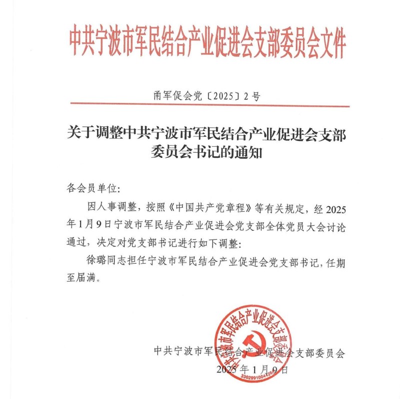 关于调整中共宁波市军民结合产业促进会支部委员会书记的通知